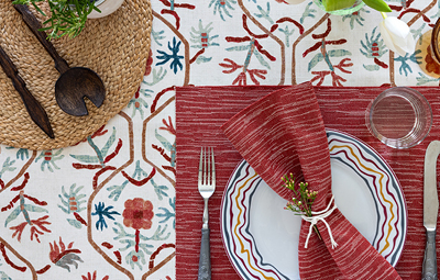 This playfully tropical collection combines large-scale botanicals, harmonious colourways, sustainable materials and artisanal printing techniques.