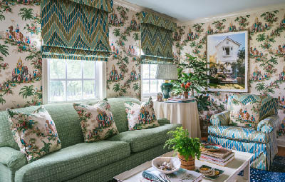 Highlights the beauty and artistry of traditional toiles in both fabrics and wallpapers