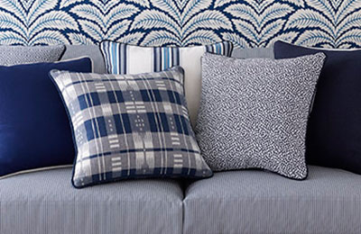 The Riviera Collection by Kravet Couture features performance fabrics in sandy neutrals and ocean blues designed for indoor and outdoor use.